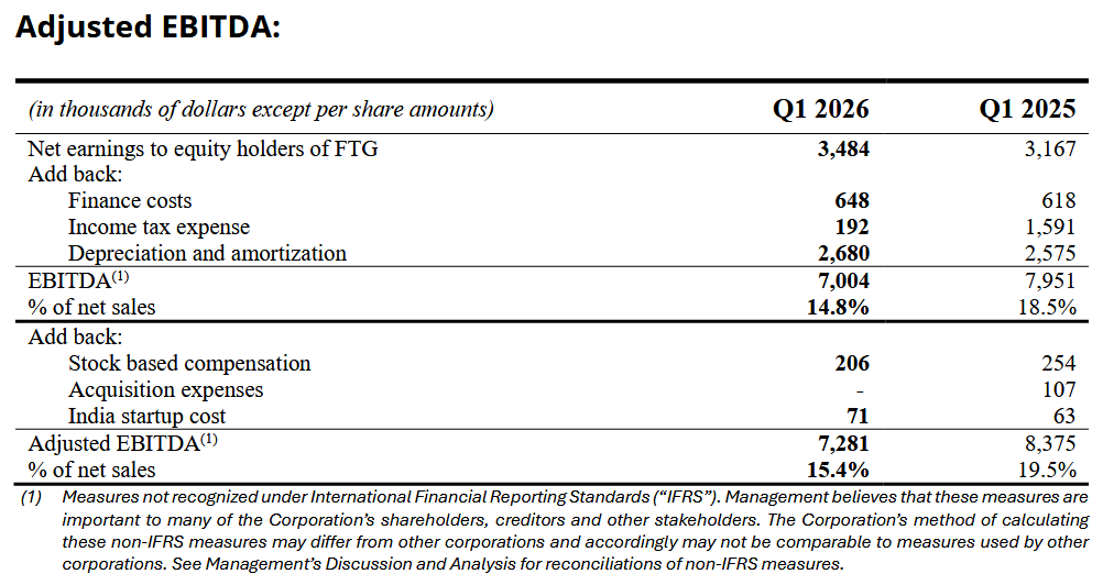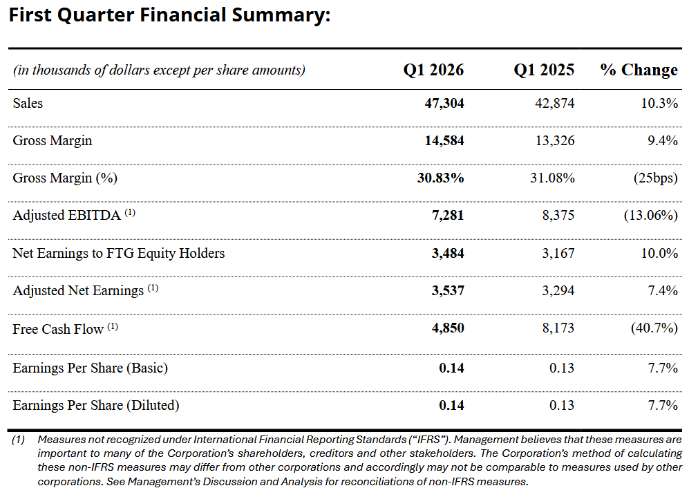 “Our first quarter was a great start to 2026,” stated Brad Bourne, President and CEO of FTG. “We achieved many strategic and operational improvements to Aerospace Calgary and legacy sites. This allowed us to deliver robust financial results despite significant foreign exchange headwinds during the quarter. We continue to see strong end market demand and remain focused on delivering long-term value to our shareholders.”