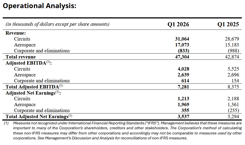 For Q1 2026, Aerospace revenue was $17.1 million, an increase of $1.9 million or 12%. As the acquisition of FLYHT Aerospace Solutions Ltd. and its subsidiaries (“FLYHT”) occurred during Q1 2025, the acquisition timing difference contributed $0.7 million, offset by $0.6M of decline due to unfavourable foreign exchange rates. Organic growth added $1.8 million. Adjusted net earnings were $2.0 million, an increase of $0.6 million year-over-year despite an increase of $1.0 million in foreign exchange loss.